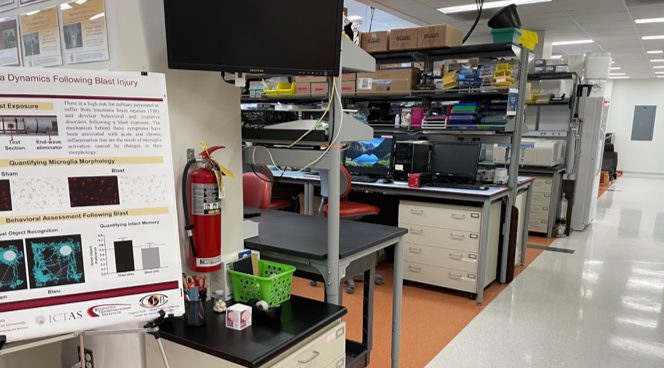 The TNT Cell Biomechanics laboratory is located in Kelly Hall on the campus of Virginia Tech. This facility houses student workstations and bench top wet laboratory research space. The lab contains important equipment for analyzing cell response to various injury mechanisms and design of novel treatment strategies such as high-speed video capabilities, biological laminar flow hoods, chemical fume hood, cell incubators, -20 and -80 freezers, analytical balances, Zeiss fluorescence/phase contrast microscopes, Real Time PCR machine, electrophoresis equipment, micro refrigerator centrifuge, bench top refrigerator centrifuge, Cyrostat tissue sectioning system, WES protein analysis station, and cell injury devices with oscilloscopes for data collection.